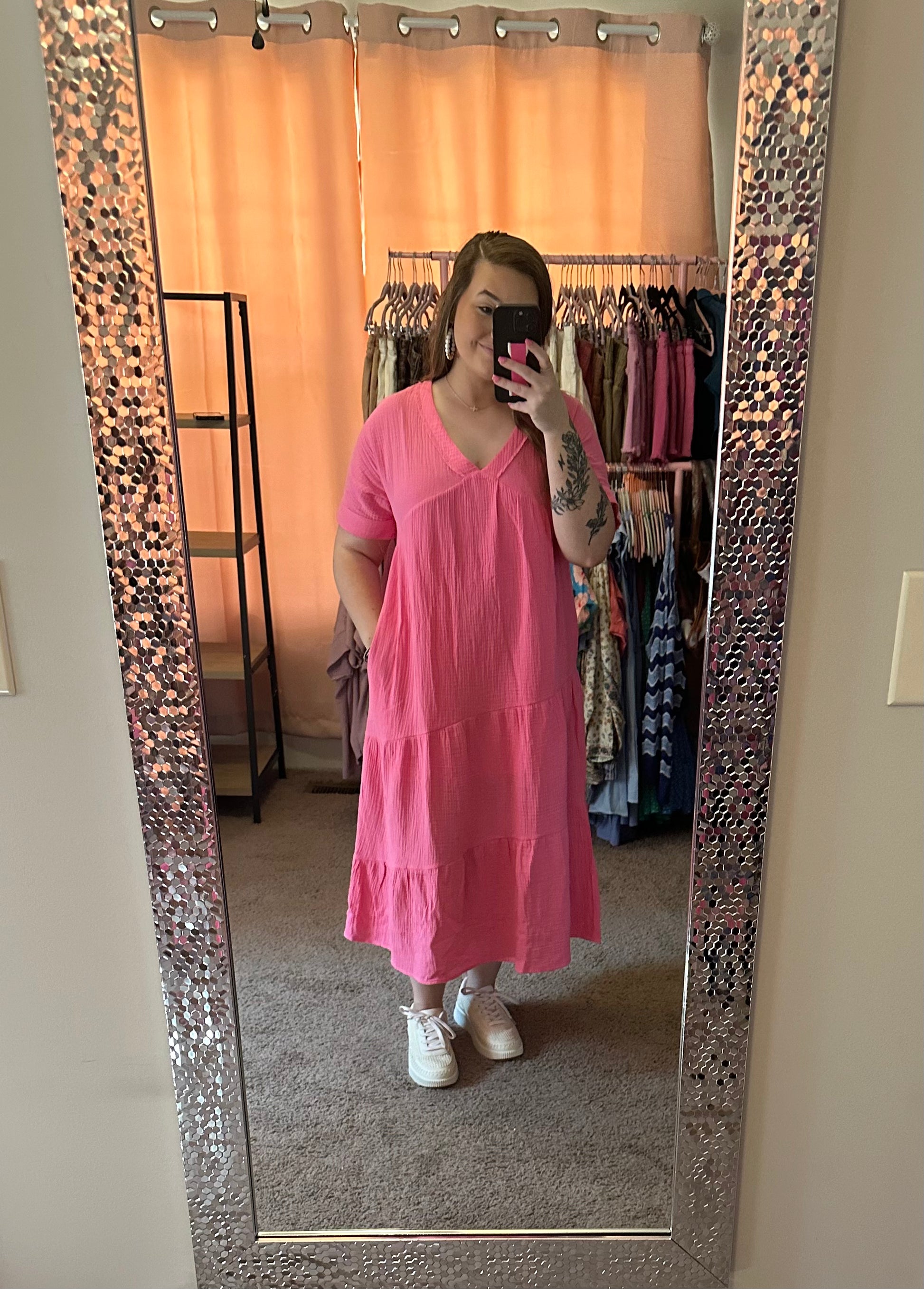 Frayed Detail Soft Crinkle Gauze Midi Dress