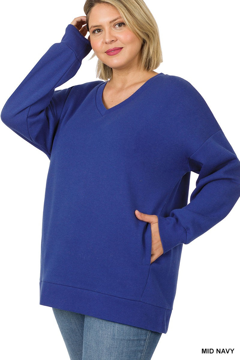 PLUS LONG SLEEVE V-NECK SWEATSHIRT WITH SIDE POCKETS TOTAL BODY LENGTH: 30", BUST: 52" approx. - MEASURED FROM 1X