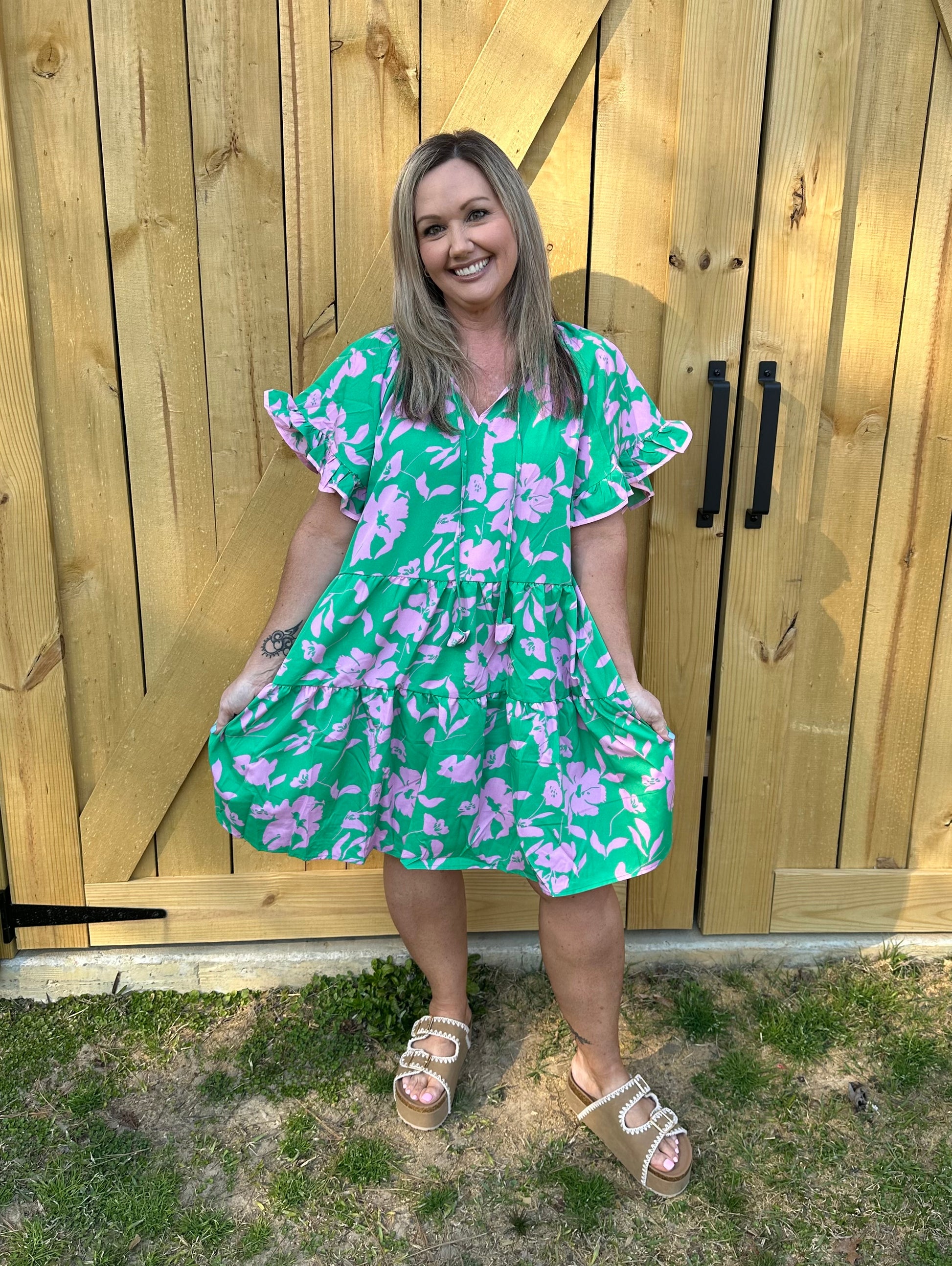 TWO TONE FLORAL PRINT TIERED A-LINE DRESS WITH RUFFLE SLEEVES AND FRONT TIE