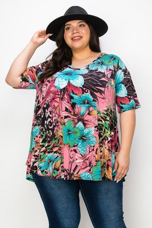 EXTRA PLUS SIZE V-NECK SHORT SLEEVES FLOWER PRINT TUNIC TOP