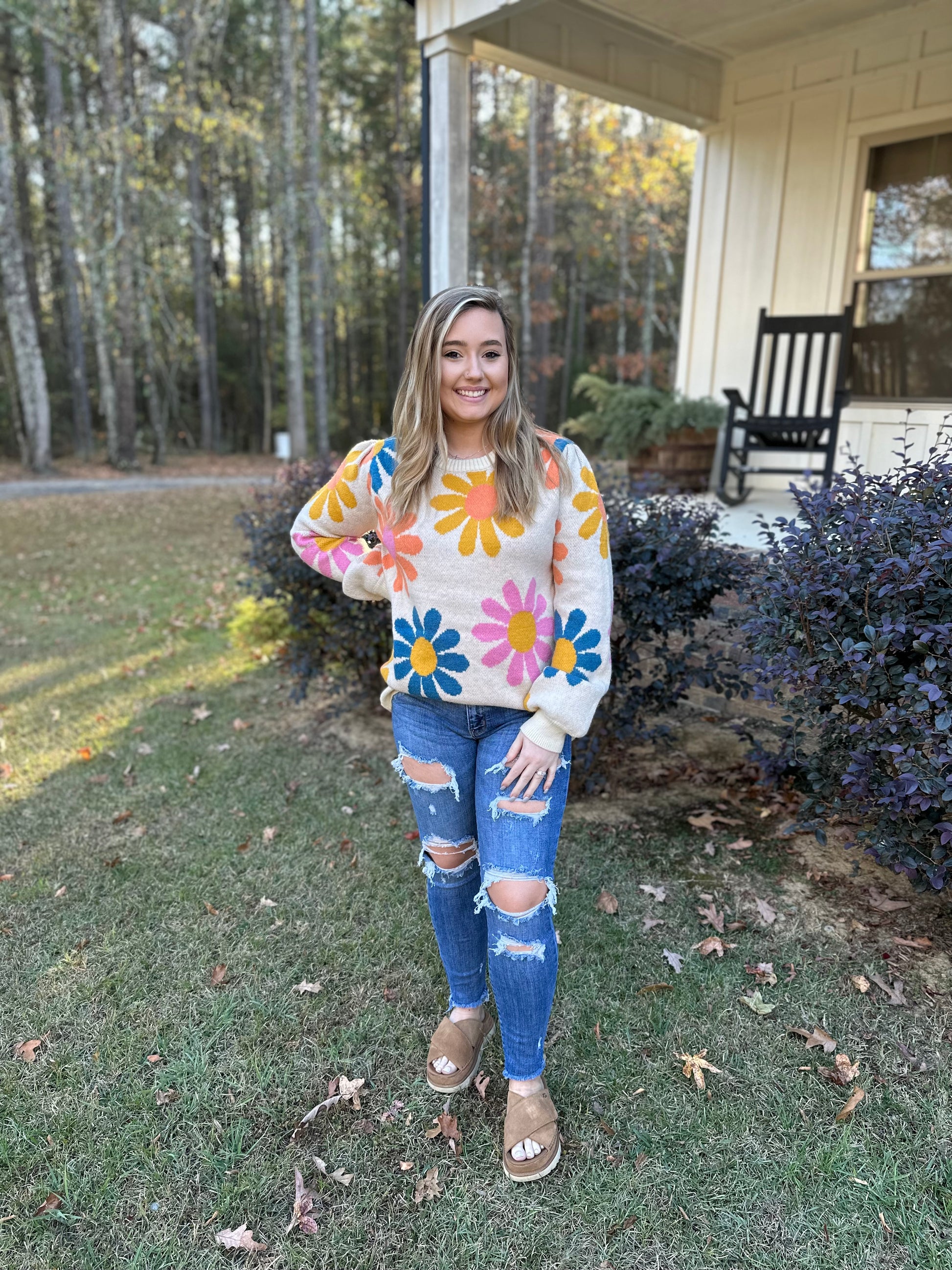 FLORAL PATTERN RELAXED FIT KNITTED SWEATER WITH RIBBED CREW