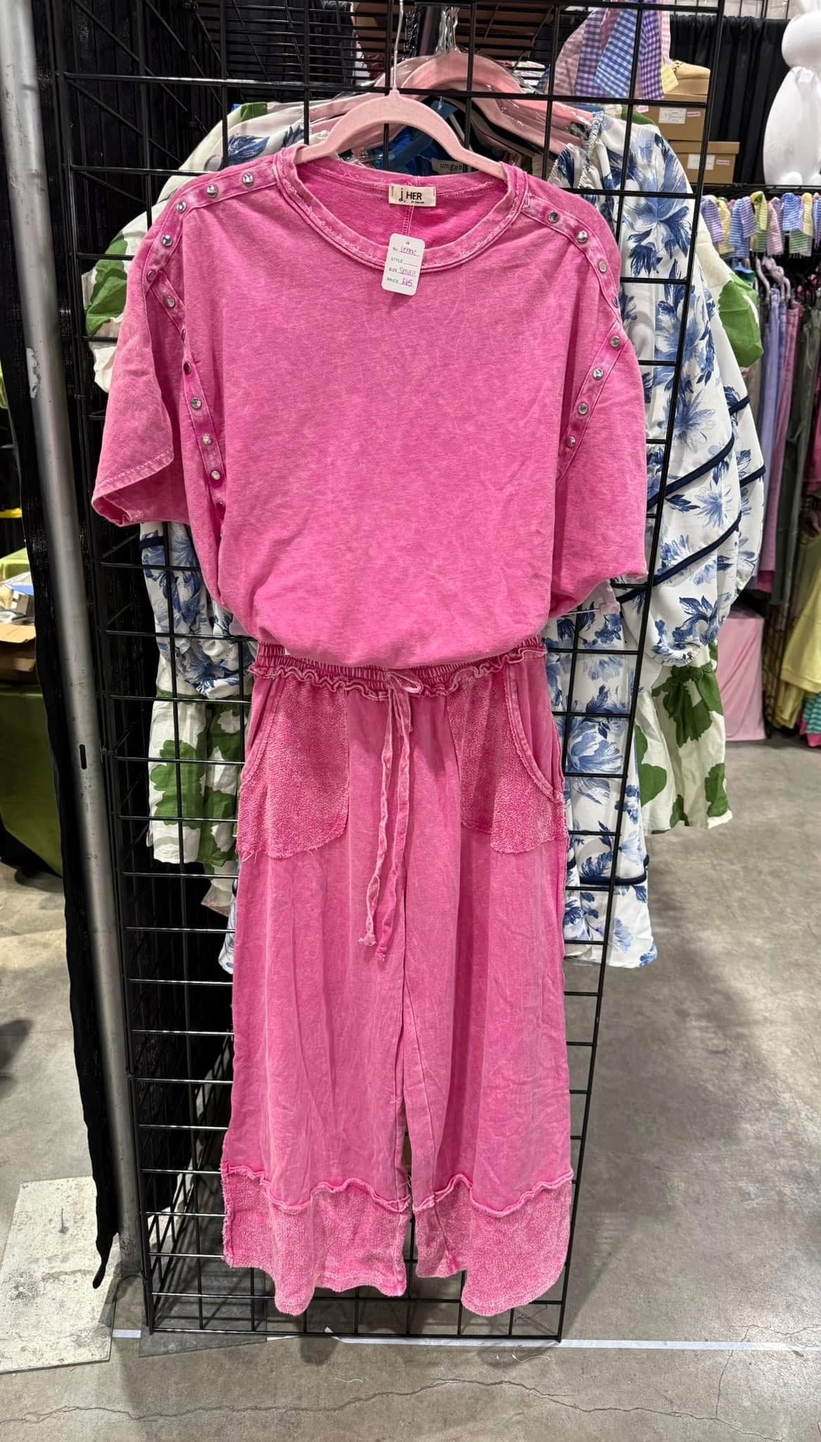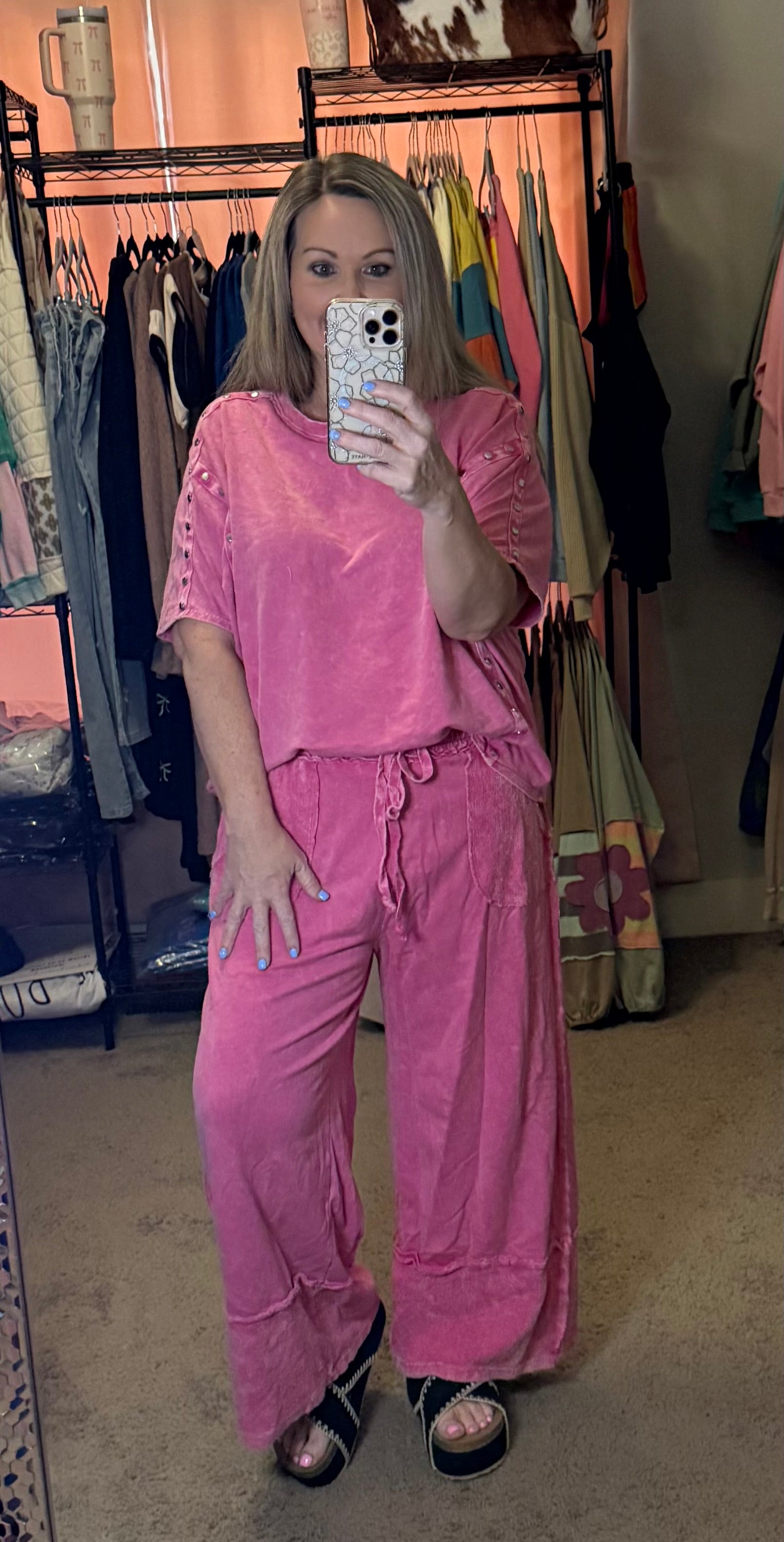 MINERAL WASH WIDE LEG PANTS WITH FRAYED RAW HEM