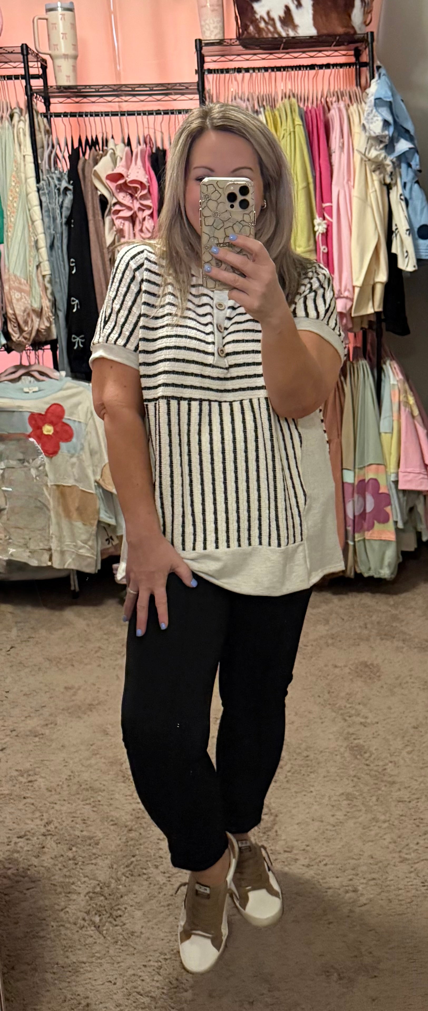 95% POLYESTER 5% SPANDEX SHORT SLEEVE STRIPE AND SOLID CONTRAST TOP WITH KANGAROO POCKET