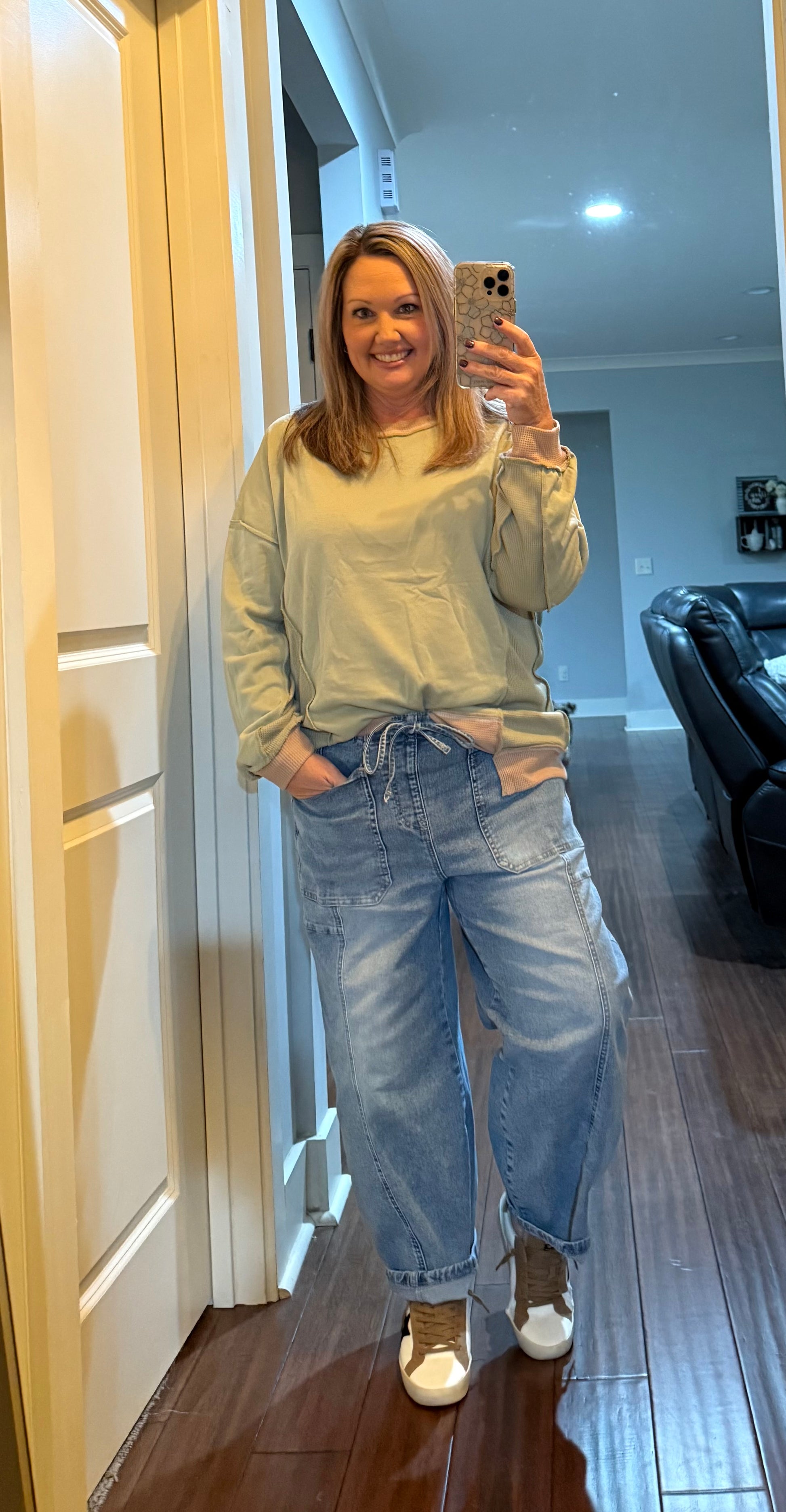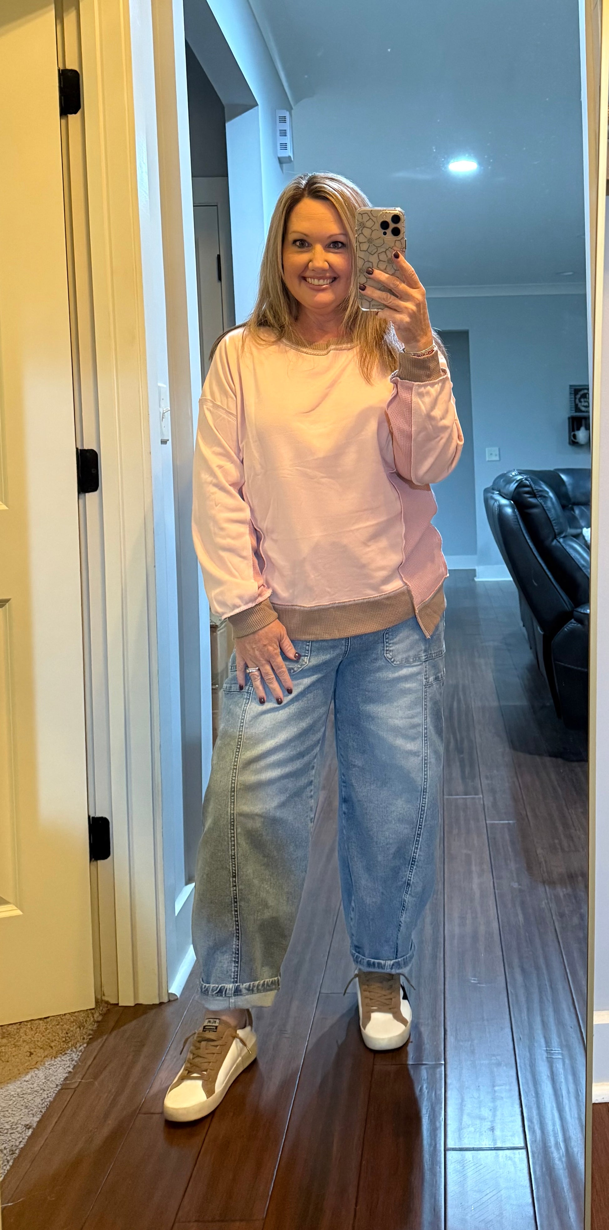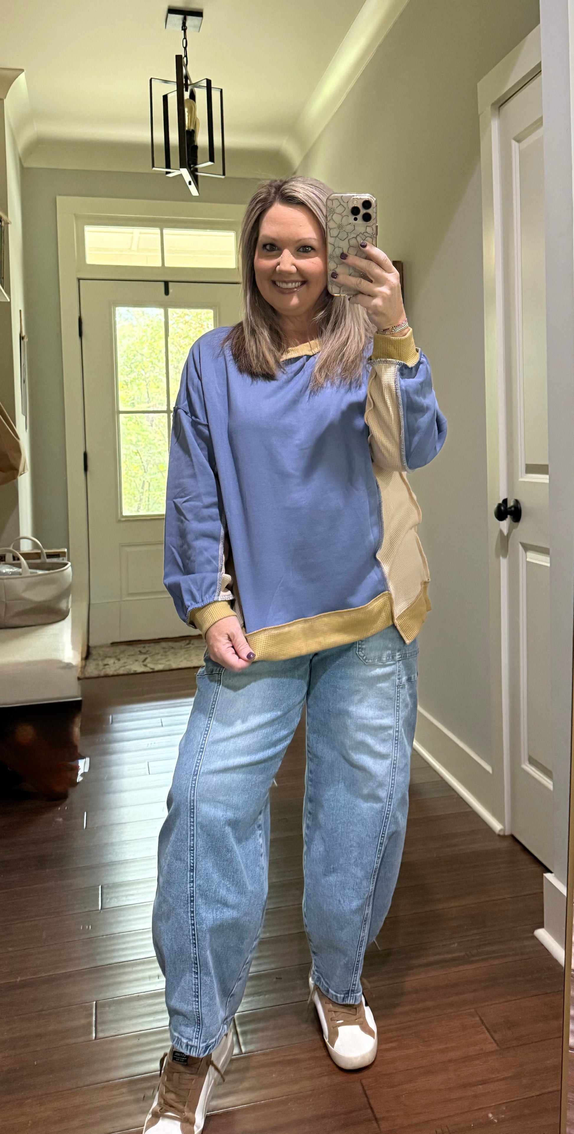 striking layered effect. - Oversized fit delivers a relaxed, streetwear-inspired silhouette. - Patchwork accents add stylish detail and visual depth. - Perfectly pairs with jeans or leggings 65% Polyester 35% Cotton