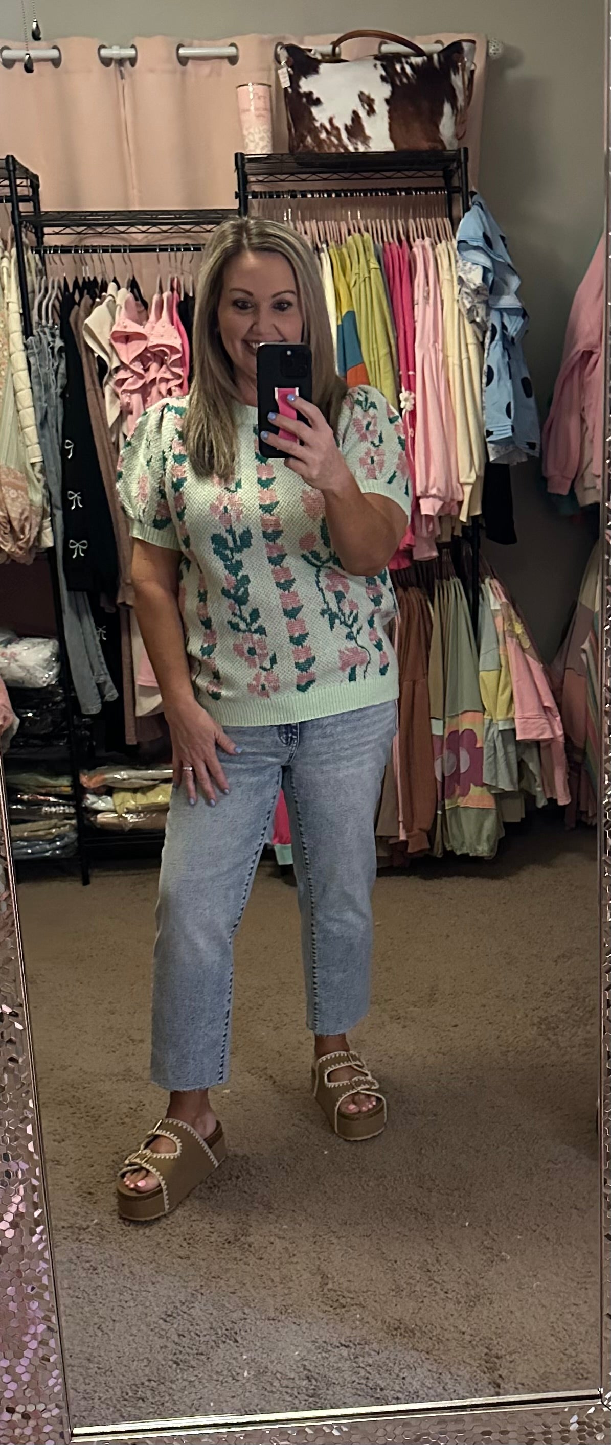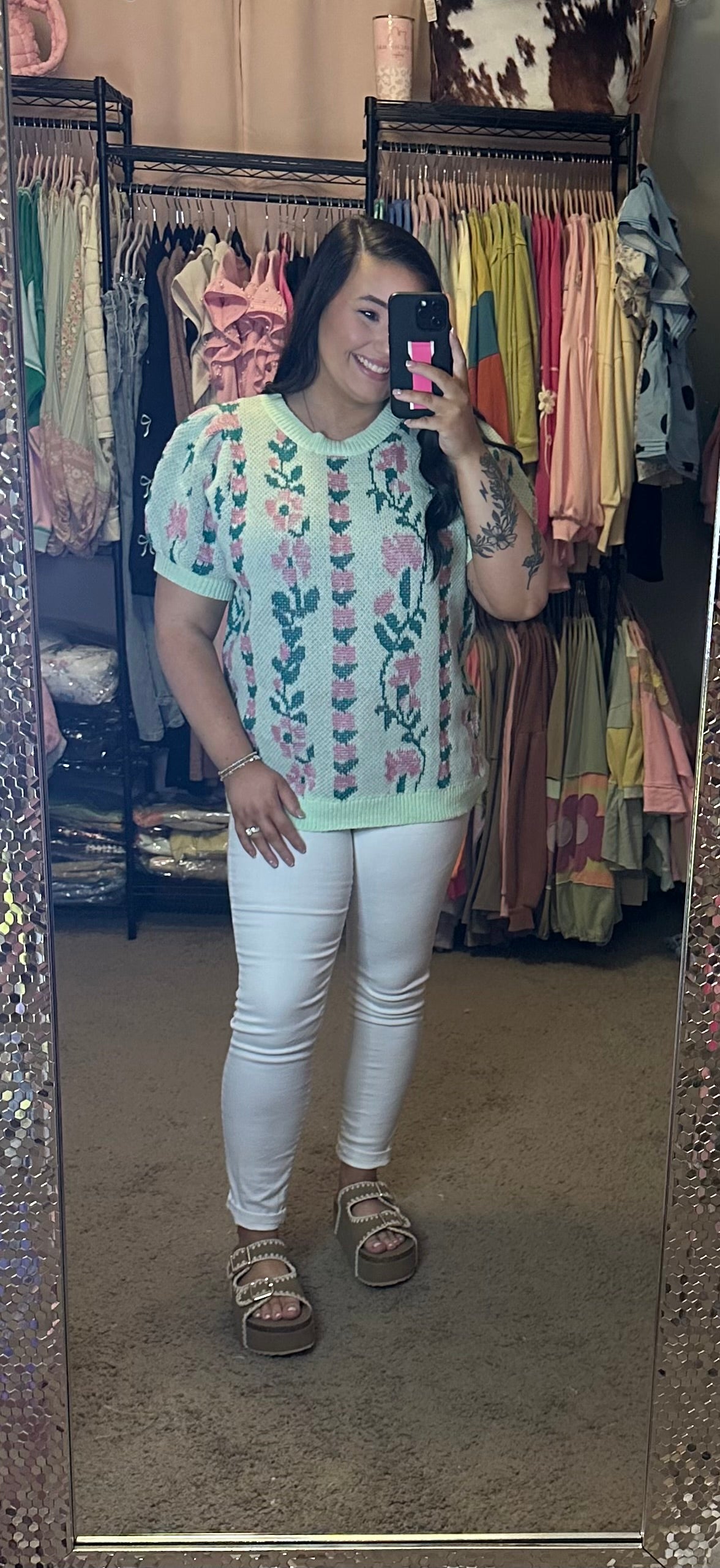 ROUND NECK BUBBLE SHORT SLEEVE FLORAL JACQUARD SWEATER KNIT TOP