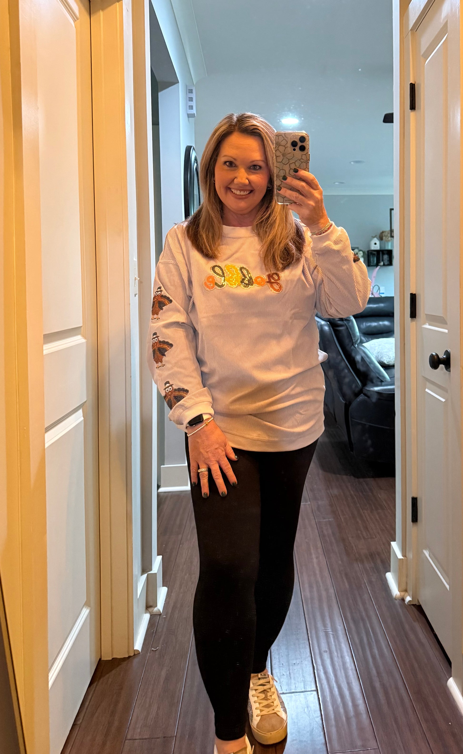 - Festive Fun: Features playful sequin "Gobble" letters and turkey